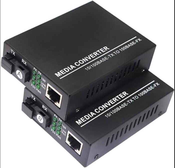 Ethernet to Fiber Media Converter RJ45 to SC 10/100 Base-TX to 100 Base-FX Range upto 20 Km Reliable SC Media Converters for Cost-Effective Network Expansion The SC Media Converters offer a robust solution for extending your network, providing excellent anti-interference capabilities and stable data transmission. With an RJ45 port and a single-fiber SC optical port, these converters facilitate seamless optical signal conversion between 10/100base-TX (Ethernet) and 100base-FX (fiber optic) standards. The single-mode SC fiber media converter set allows for transmission distances of up to 20 km. Key Features: Single-Mode Fiber Converter: Equipped with a high-quality photoelectric module, this converter ensures superior optical and electrical performance for reliable data transmission. Unlike dual-fiber systems, the single-mode fiber design doubles the transmission capacity with one-way signal transmission. Durable Metal Housing: Built with a sturdy, high-quality metal case, this converter is suitable for both indoor and outdoor environments. It features enhanced heat dissipation with cooling vents on both sides, ensuring long-term, uninterrupted operation. Industry Compliance: Fully compliant with IEEE802.3 10Base-T, IEEE802.3u 100Base-TX, and 100Base-FX standards. It supports 10M/100M adaptive Ethernet, full/half duplex modes, direct line/crossover cable connections, and includes features like duplex flow control, backpressure control, and broadcast storm prevention. It supports UTP connections up to 100 meters, and single-mode fiber connections up to 100 km. Benefits of Using Media Converters: In today’s complex networks, increasing data demands, higher speeds, and longer distances are crucial for optimal performance. SC Media Converters provide the flexibility to integrate fiber optics into existing copper networks, enabling seamless connectivity and reducing costs. These converters support various data rates and media types, ensuring a more reliable and efficient LAN network.
