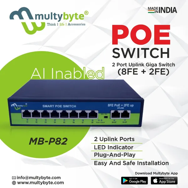 Unmanaged AI PoE switch with 8FE+2FE ports. 100Mbps, 802.3af/at support, 120W power, 250m range, ideal for CCTV setups. Shop at multybyte.com